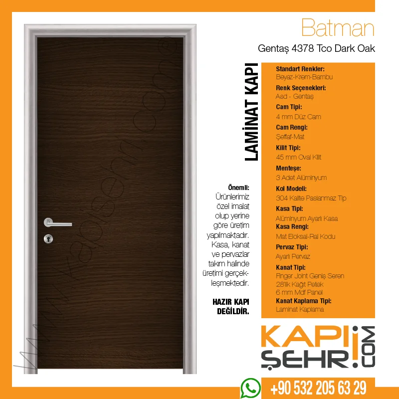 Gentaş 4378 Tco Dark Oak Batman modeli, doğal ahşap etkisiyle proje disiplinine uygun uygulama ve uzun ömürlü kullanım beklentisini karşılamak üzere geliştirilen ayarlı alüminyum kasalı laminat kapıdır. Hastane, okul, ofis, otel, kamu yapıları ve ticari projelerde değerlendirilebilen bu model; yoğun sirkülasyon bulunan alanlarda dayanım, kolay temizlik ve düzenli görünüm sunar. Ayarlı alüminyum kasa sistemi farklı duvar kalınlıklarına uyum sağlayarak şantiye uygulamasını kolaylaştırır; ürün projeye göre camlı, menfezli, paslanmaz tekmelikli veya farklı donanım seçenekleriyle hazırlanabilir. Ürün kasa, kanat ve pervaz seti olarak projeye göre imal edilir; standart hazır kapı değildir.