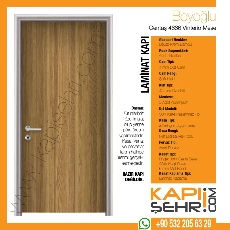 Kapı Şehri üretimi Gentaş 4666 Vinterio Mese Beyoğlu modeli, sıcak ve doğal dekor karakteriyle proje bazlı işlerde estetik ve fonksiyonelliği bir araya getiren ayarlı alüminyum kasalı laminat kapı seçeneklerinden biridir. Hastane, okul, ofis, otel, kamu yapıları ve ticari projelerde değerlendirilebilen bu model; yoğun sirkülasyon bulunan alanlarda dayanım, kolay temizlik ve düzenli görünüm sunar. Farklı duvar kalınlıklarına uyum sunan ayarlı alüminyum kasa yapısı montaj sürecine esneklik kazandırırken, kapı kanadı projeye göre cam, menfez, tekmelik ve farklı aksesuarlarla kurgulanabilir. Kasa, kanat ve pervaz takım halinde ölçüye özel üretilir; hazır kapı değildir.