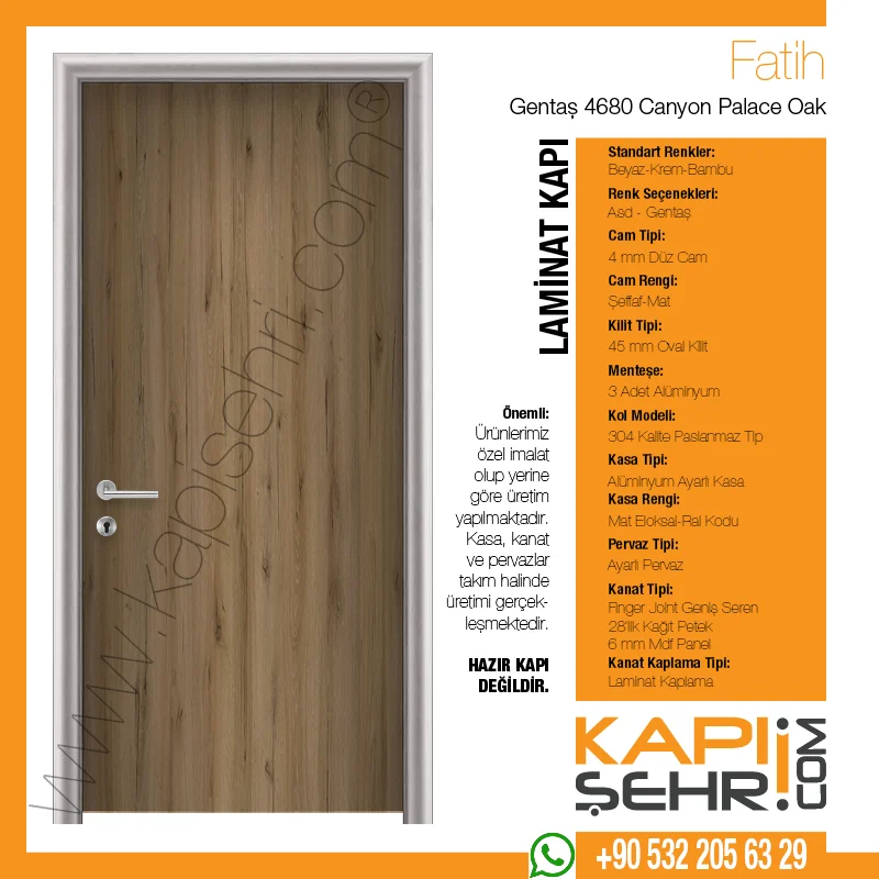 Gentaş 4680 Canyon Palace Oak Fatih modeli, Kapı Şehri’nin proje odaklı üretim anlayışıyla sıcak ve doğal dekor karakteriyle mimari bütünlüğü teknik gereksinimlerle buluşturan laminat kapı modelleri arasında yer alır. Otel, toplantı alanı, okul, klinik ve yönetim binası projelerinde kullanılabilen bu model; kontrollü detay kurgusu ve yoğun kullanıma uygun yapısıyla tercih edilir. Proje detayına göre cam açıklığı, havalandırma menfezi, paslanmaz tekmelik, kilit ve kol seçenekleriyle özelleştirilebilen bu model, ayarlı kasa yapısıyla uygulama sürecine avantaj sağlar. Kasa, kanat ve pervaz takım halinde ölçüye özel üretilir; hazır kapı değildir.