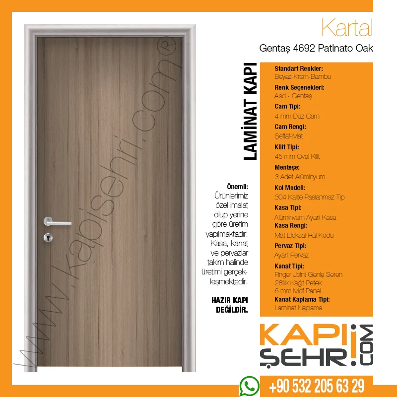 Kapı Şehri üretimi Gentaş 4692 Patinato Oak Kartal modeli, sıcak ve doğal dekor karakteriyle proje bazlı işlerde estetik ve fonksiyonelliği bir araya getiren ayarlı alüminyum kasalı laminat kapı seçeneklerinden biridir. Özellikle proje bazlı sağlık, eğitim ve kurumsal yapılarda tercih edilen bu model; çizilme ve darbe riskinin bulunduğu alanlarda performans odaklı bir çözüm sunar. Farklı duvar kalınlıklarına uyum sunan ayarlı alüminyum kasa yapısı montaj sürecine esneklik kazandırırken, kapı kanadı projeye göre cam, menfez, tekmelik ve farklı aksesuarlarla kurgulanabilir. Kasa, kanat ve pervaz takım halinde ölçüye özel üretilir; hazır kapı değildir.