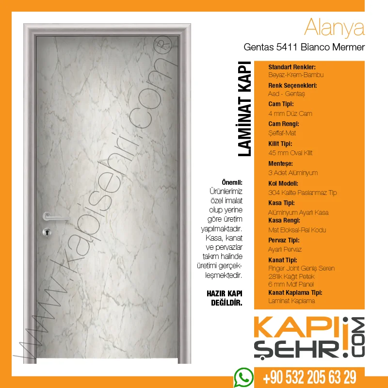 Gentaş 5411 Bianco Mermer Alanya modeli, taş/mermer görünümünü projelere taşıyan yüzeyiyle proje disiplinine uygun uygulama ve uzun ömürlü kullanım beklentisini karşılamak üzere geliştirilen ayarlı alüminyum kasalı laminat kapıdır. Sağlık, eğitim, ofis ve konaklama projelerinde kullanılabilen bu model; günlük temizlik rutininin önemli olduğu alanlarda pratik bakım ve uzun ömürlü kullanım avantajı sağlar. Ayarlı alüminyum kasa sistemi farklı duvar kalınlıklarına uyum sağlayarak şantiye uygulamasını kolaylaştırır; ürün projeye göre camlı, menfezli, paslanmaz tekmelikli veya farklı donanım seçenekleriyle hazırlanabilir. Kasa, kanat ve pervaz takım halinde ölçüye özel üretilir; hazır kapı değildir.