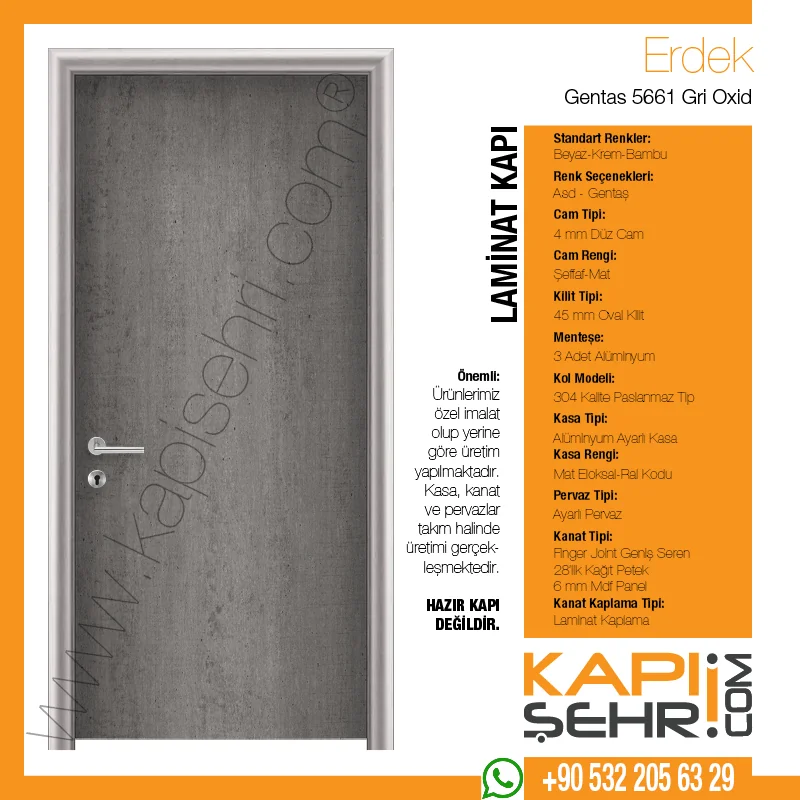 Kapı Şehri üretimi Gentaş 5661 Gri Oxid Erdek modeli, metalik ve endüstriyel yüzey karakteriyle proje bazlı işlerde estetik ve fonksiyonelliği bir araya getiren ayarlı alüminyum kasalı laminat kapı seçeneklerinden biridir. Ofis, idari bina, hastane, okul ve toplu konut projelerinde uygulanabilen bu model; dekor sürekliliği, kurumsal görünüm ve saha kullanımına uygun dayanım özellikleriyle öne çıkar. Farklı duvar kalınlıklarına uyum sunan ayarlı alüminyum kasa yapısı montaj sürecine esneklik kazandırırken, kapı kanadı projeye göre cam, menfez, tekmelik ve farklı aksesuarlarla kurgulanabilir. Ürün kasa, kanat ve pervaz seti olarak projeye göre imal edilir; standart hazır kapı değildir.