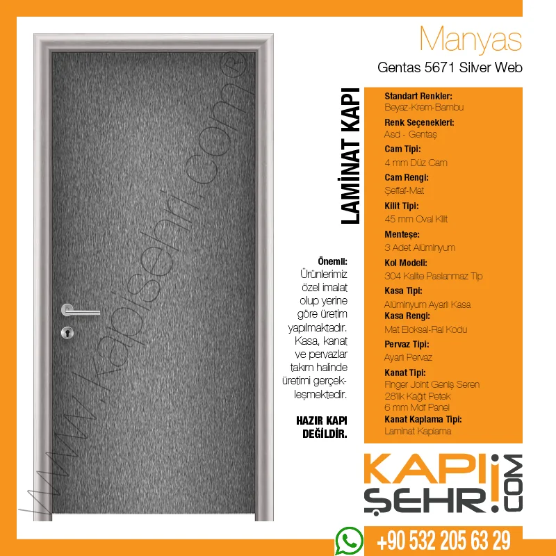 Gentaş 5671 Silver Web Manyas modeli, özgün desen karakteriyle proje disiplinine uygun uygulama ve uzun ömürlü kullanım beklentisini karşılamak üzere geliştirilen ayarlı alüminyum kasalı laminat kapıdır. Hastane, okul, ofis, otel, kamu yapıları ve ticari projelerde değerlendirilebilen bu model; yoğun sirkülasyon bulunan alanlarda dayanım, kolay temizlik ve düzenli görünüm sunar. Ayarlı alüminyum kasa sistemi farklı duvar kalınlıklarına uyum sağlayarak şantiye uygulamasını kolaylaştırır; ürün projeye göre camlı, menfezli, paslanmaz tekmelikli veya farklı donanım seçenekleriyle hazırlanabilir. Kasa, kanat ve pervaz takım halinde ölçüye özel üretilir; hazır kapı değildir.
