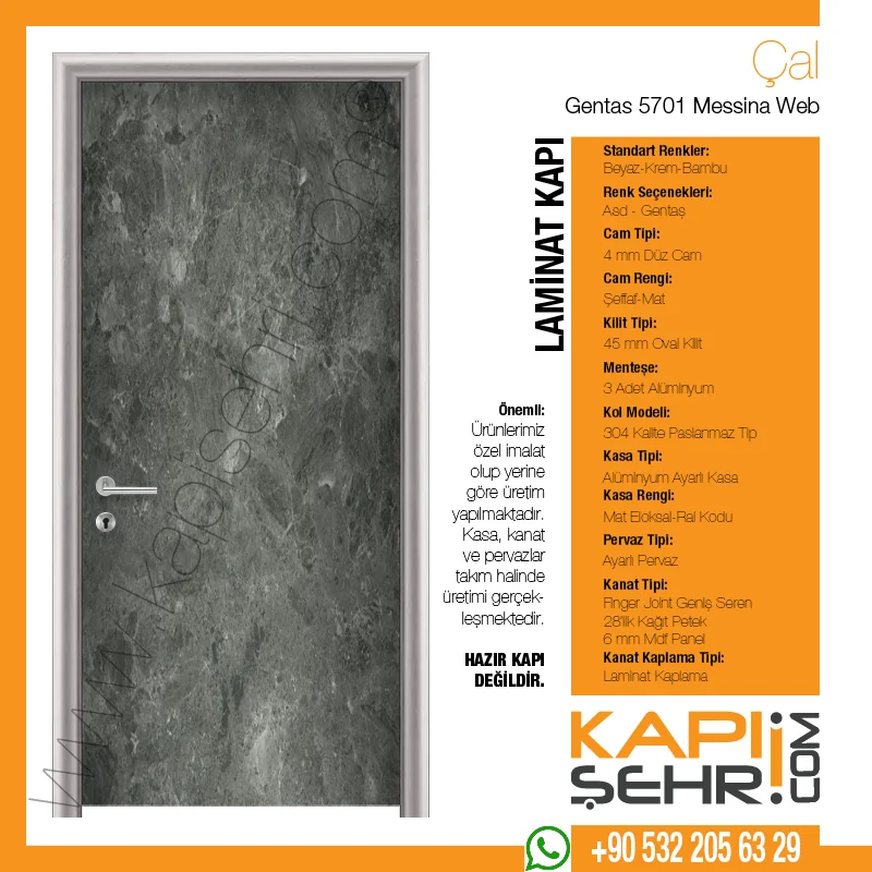 Gentaş 5701 Messina Web Çal modeli, Kapı Şehri’nin proje odaklı üretim anlayışıyla yüzey dokusu ve modern görünümüyle mimari bütünlüğü teknik gereksinimlerle buluşturan laminat kapı modelleri arasında yer alır. Sağlık, eğitim, ofis ve konaklama projelerinde kullanılabilen bu model; günlük temizlik rutininin önemli olduğu alanlarda pratik bakım ve uzun ömürlü kullanım avantajı sağlar. Proje detayına göre cam açıklığı, havalandırma menfezi, paslanmaz tekmelik, kilit ve kol seçenekleriyle özelleştirilebilen bu model, ayarlı kasa yapısıyla uygulama sürecine avantaj sağlar. Kasa, kanat ve pervaz üretimi proje ölçülerine göre birlikte planlanır; ürün hazır kapı olarak sevk edilmez.