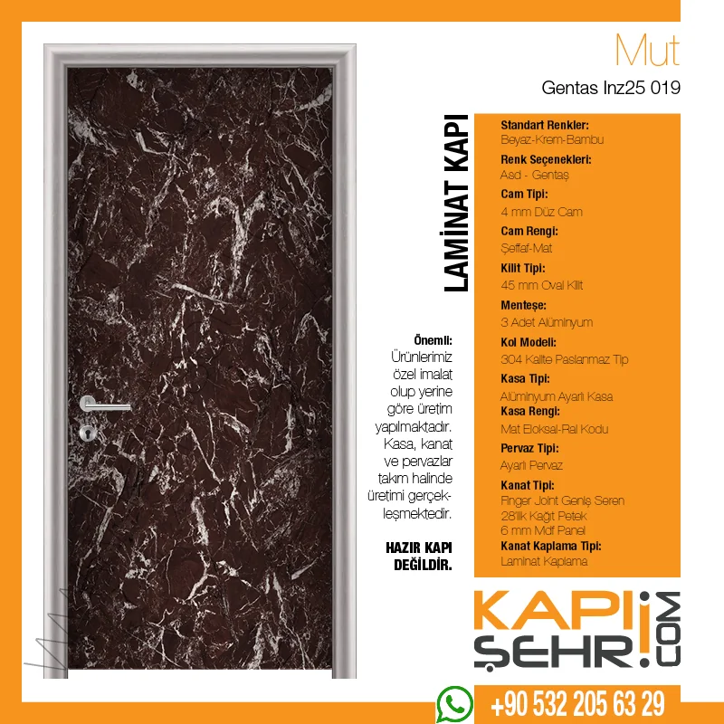 Gentaş Inz25 019 Mut modeli, proje estetiğine kolay uyumuyla proje disiplinine uygun uygulama ve uzun ömürlü kullanım beklentisini karşılamak üzere geliştirilen ayarlı alüminyum kasalı laminat kapıdır. Sağlık, eğitim, ofis ve konaklama projelerinde kullanılabilen bu model; günlük temizlik rutininin önemli olduğu alanlarda pratik bakım ve uzun ömürlü kullanım avantajı sağlar. Ayarlı alüminyum kasa sistemi farklı duvar kalınlıklarına uyum sağlayarak şantiye uygulamasını kolaylaştırır; ürün projeye göre camlı, menfezli, paslanmaz tekmelikli veya farklı donanım seçenekleriyle hazırlanabilir. Kasa, kanat ve pervaz takım halinde ölçüye özel üretilir; hazır kapı değildir.