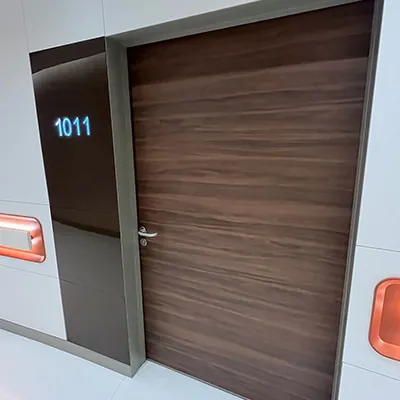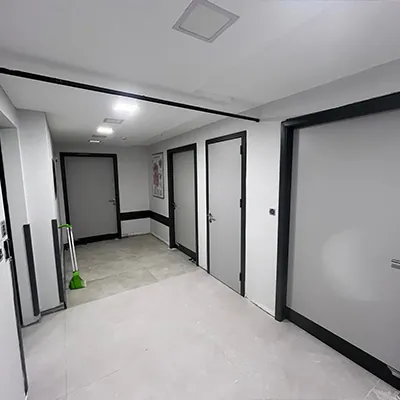 Hastane koridorları, sedye, tekerlekli sandalye ve ekipman trafiğinin en yoğun olduğu alanlardır. **Laminat kapılarımızın** kenarlarında kullanılan darbe emici PVC bantlar ve isteğe bağlı olarak eklenen paslanmaz çelik tekme plakaları, bu zorlu koşullara karşı üstün bir koruma sağlayarak kapıların ömrünü uzatır.